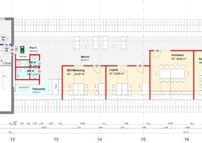 In dieser Bürofläche befinden sich getrennte WC Einheiten, sowie eine kleine Teeküche. EDV Verkabelung, teils Teppich- und oder Designboden.